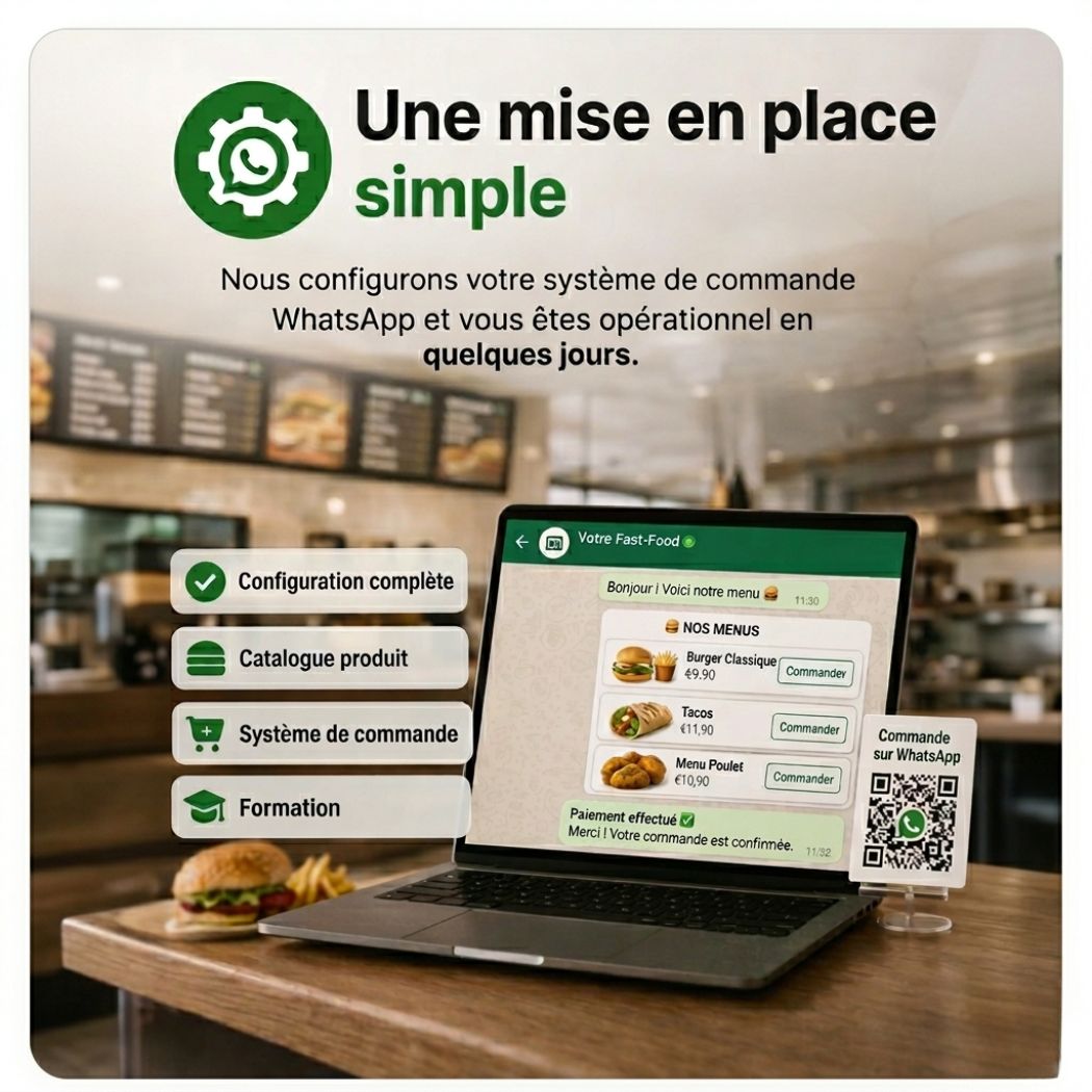 Nous configurons votre système de commande WhatsApp et vous êtes opérationnel en quelques jours.